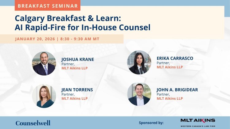 Join MLT Aikins and Counselwell for a free, in-person breakfast seminar on January 20, 2026, designed exclusively for in-house counsel seeking practical real-world insights on artificial intelligence in legal practice.