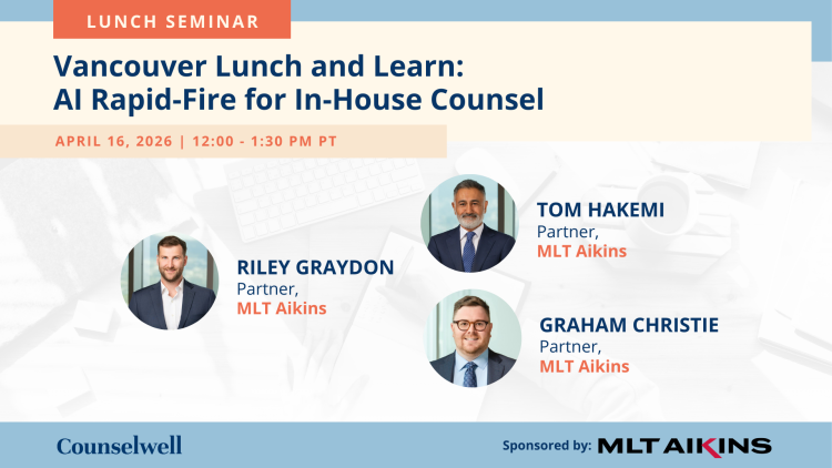 Join MLT Aikins and Counselwell for a free, in-person lunch and learn seminar on April 16, 2026, designed exclusively for in-house counsel seeking practical real-world insights on artificial intelligence in legal practice.